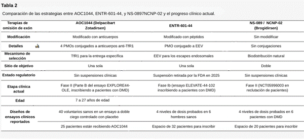Tabla 2. Comparación de las estrategias entre AOC1044, ENTR-601-44, y NS-089/NCNP-02 y el progreso clínico actual.