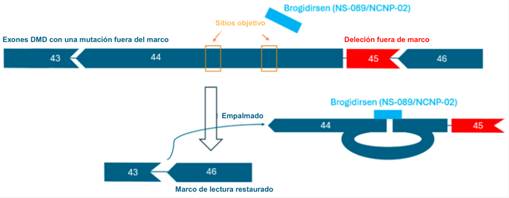 Briogidirsen (NS-089/NCNP-02) es un PMO sin modificar con un enfoque novedoso de doble objetivo para el exón 44 de DMD [32, 66]. Esta terapia obtuvo la designación de medicamento huérfano y el estatus de terapia innovadora en Estados Unidos y Europa durante 2023 [67]. La secuencia de 24 ácidos nucleicos de NS-089/NCNP-02 es ‘TTGTGTCTTTCTTCTGTTAGCCAC’ (Código FDA UNII: 4KM8P975UM). Brogidirsen contiene dos secuencias de 12 bases conectadas directamente que están diseñadas para omitir el exón 44 al dirigirse a las posiciones 64-75 y 92-103 dentro del exón (Figura 2) [68]. Se ha mostrado potencial terapéutico en un estudio preclínico previo, donde un tratamiento de incubación de 1 hora con fibroblastos derivados de pacientes y convertidos con MyoD, presentando una deleción del exón 45 del gen DMD, resultó en una omisión de exón 44 con una EC de 0.63 μmol/L 7 días después de la incubación con el tratamiento de NS-089/NCNP-02. En un ensayo clínico posterior por Nippon-Shinyaku y NS Pharma (NCT04129294), se observó que el tratamiento restauró la expresión de distrofina a aproximadamente el 25% de los niveles observados en controles saludables [66, 68]. Una vez que NS-089/NCNP-02 se une a los lugares dirigidos en el ARN, los exones que cambian de marco pueden ser empalmados y omitidos (Figura 3). Debido a que las PMOs carecen de carga, se percibe que tienen un mejor perfil de seguridad y estabilidad mejorada en comparación con los ASOs cargados [44, 69].