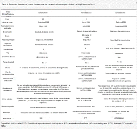 Tabla 1. Resumen de criterios y tabla de comparación para todos los ensayos clínicos de brogidirsen en 2025.