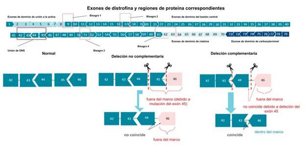 Los exones del gen DMD pueden ser uno de los nucleótidos 3n, 3n+1, ó 3n-1; es por esto que las deleciones de exón, el tipo más común de mutación de distrofina [33], pueden tener tres efectos diferentes en el marco de lectura. Añadir una ‘deleción’ usando la omisión de exón puede sólo corregir el marco de lectura si la ‘eliminación’ complementa una deleción fuera del marco existente. Por ejemplo, un tipo 3n+1 de deleción sería capaz de restaurar el marco de lectura sólo para ciertas mutaciones. Inducir la deleción del exón 44, en este caso, puede entonces sólo compensar las deleciones del tipo 3n-1. Esto se representa con diferentes formas de exón en diagramas, con algunas deleciones de omisión de exón potenciales resultando en dos exones que no encajan juntos en un marco de lectura funcional (Figura 1). Estos son factores a considerar al diseñar terapias de omisión de exón de ASO, junto con la eficiencia de la omisión del exón, la funcionalidad de la proteína, y la aplicabilidad potencial para otras mutaciones [33].
