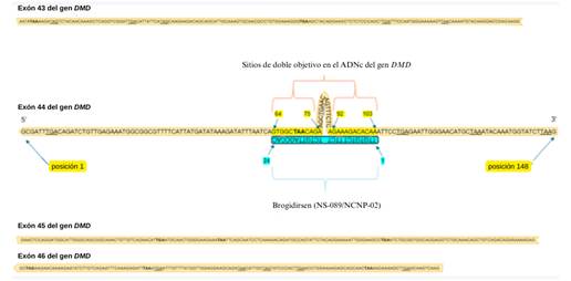 Figura 2. Los sitios orientados de brogidirsen (NS-089/NCNP-02) dentro de la secuencia del exón 44 del gen DMD. Las letras negritas y lo resaltado indican codones de parada.