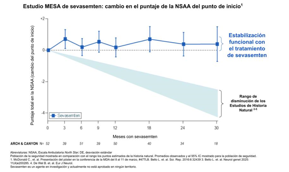 - Estabilización sostenida por 3.5 años: los puntajes funcionales en la Escala Ambulatoria North Star (NSAA, por sus siglas en inglés) de los participantes en los estudios ARCH y CANYON tratados con sevasemten se mantuvieron estables después de 3.5 y 2 años, respectivamente. Los participantes en el estudio CANYON con placebo quienes se pasaron al estudio MESA también tuvieron puntajes funcionales en la NSAA que tendieron a la alza durante el primer año después de cambiarse a sevasemten.
